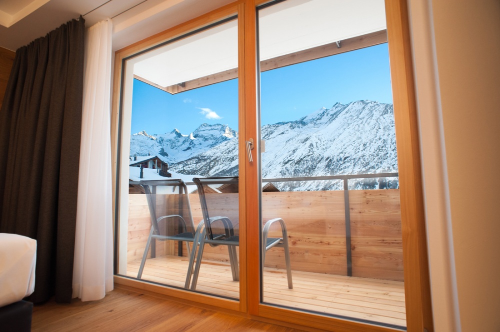 Les balcons au sud et à l’est ainsi que les fenêtres panoramiques vous offrent une vue magnifique sur les sommets de Saas.